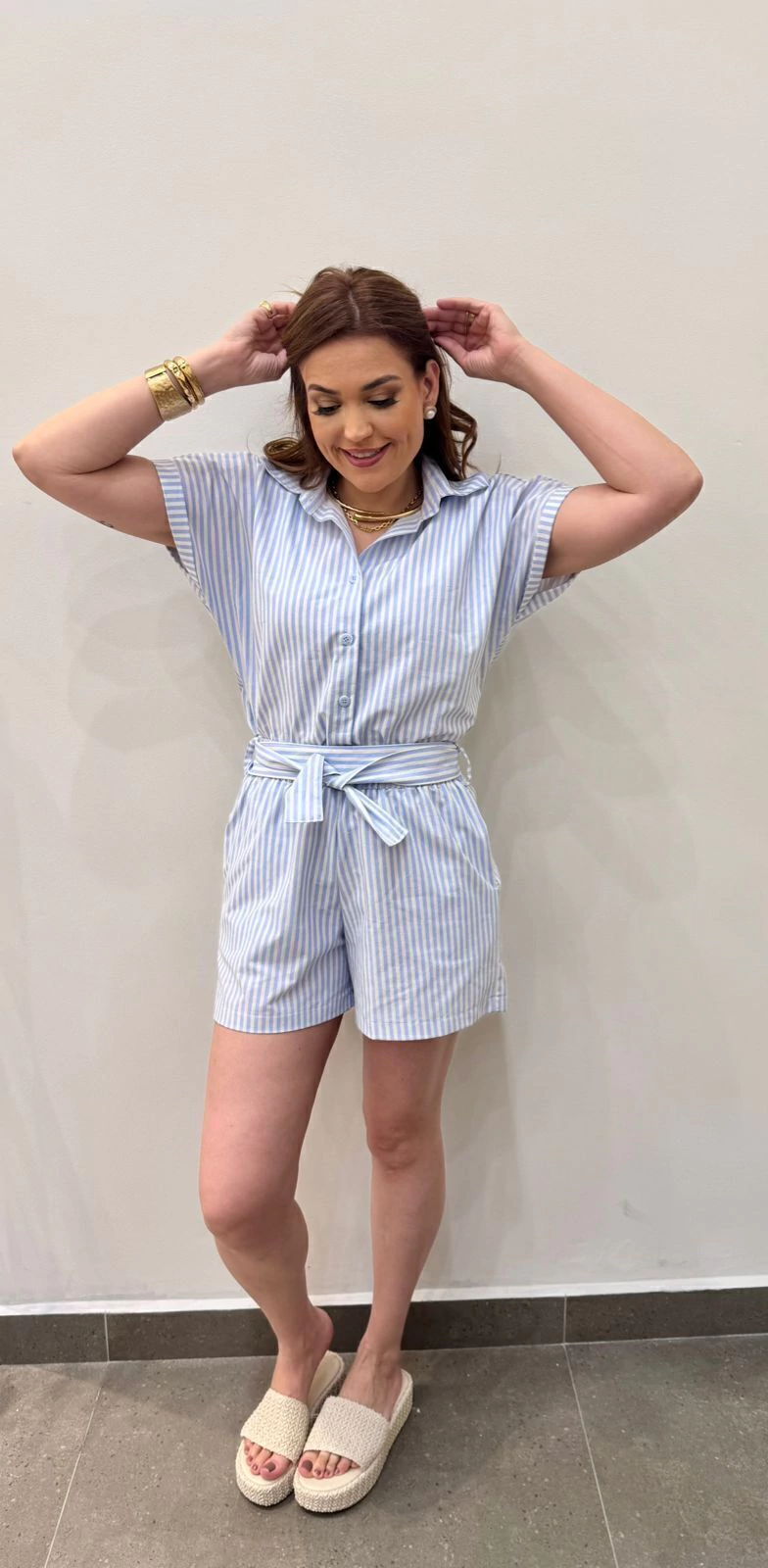 O Conjunto Priscila é leve, fresquinho e superversátil. A camisa listrada azul-claro com branco possui gola de camisa, abotoamento frontal e mangas soltinhas estilo kimono. A faixa na cintura permite ajustar o caimento com conforto. O short coordenado tem cós com passantes, bolsos laterais funcionais e comprimento elegante para o dia a dia.
