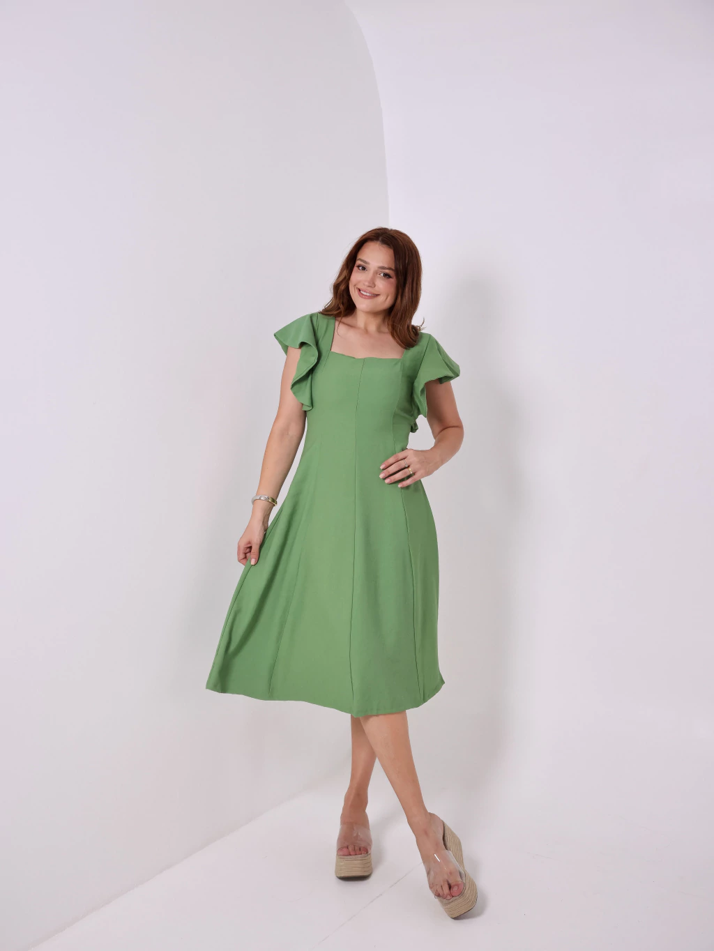 DESCRIÇÃO: Vestido midi com design delicado e romântico. Destaque para o decote quadrado e as mangas em babados, que trazem um charme extra à peça. A modelagem ajustada ao busto e fluida na saia garante conforto e movimento, perfeito para eventos casuais e elegantes. Um look que combina feminilidade e leveza.