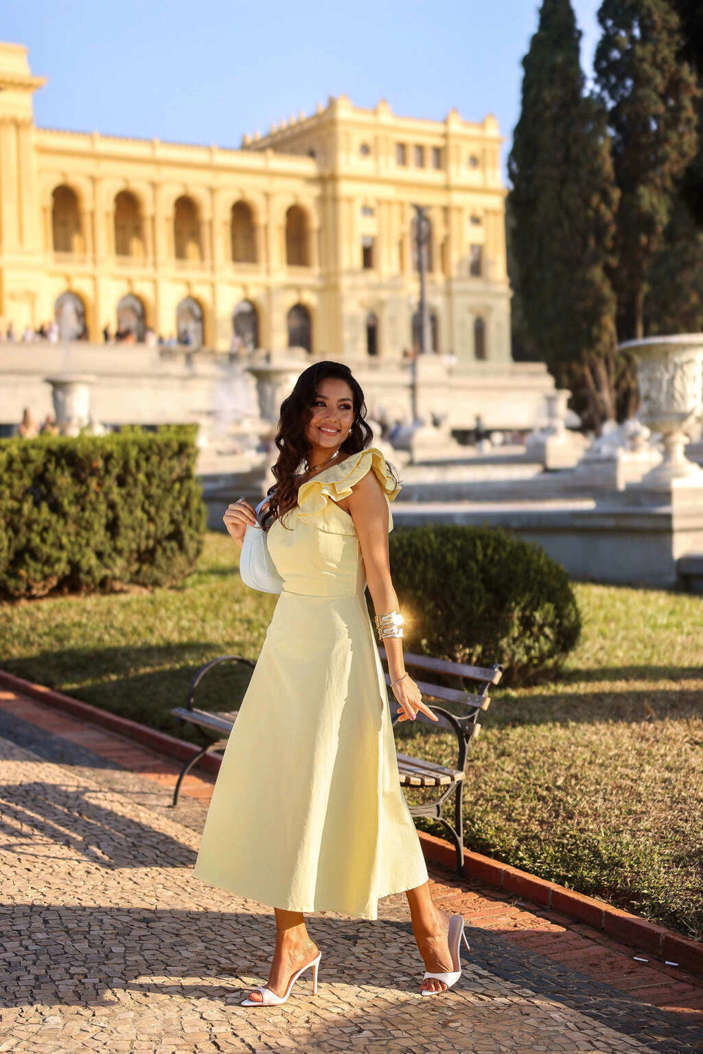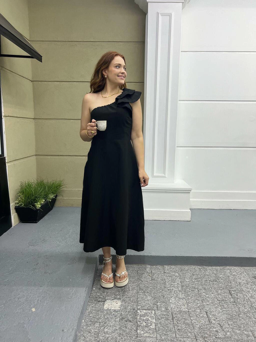 DESCRIÇÃO: Este vestido midi de um ombro só é confeccionado em linho de alta qualidade, oferecendo um caimento sofisticado e confortável. Com um design assimétrico e manga com babados delicados, ele adiciona um toque romântico ao visual. A peça conta com uma prática abertura lateral por zíper, garantindo um ajuste perfeito. Ideal para eventos especiais, este vestido combina elegância e modernidade em qualquer ocasião.